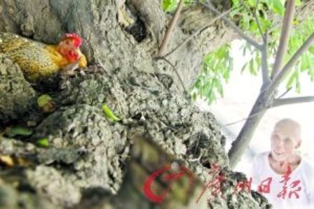 记者来到三水芦苞上渡头村村头的树上见到这只三水“怪鸡”,正气定神闲地窝在约两米高的树丫上,进行“生育”大计。满头白发的村民蔡善球告诉记者,这只怪鸡属该村养殖户蔡桂聪所有,每天早上8~9时左右,准时飞上村头的树丫头生蛋。
