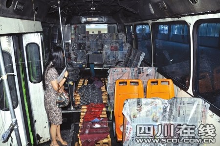 试验开始前,记者在试验现场打探了一番:试验车是一辆绿色的CFC6110D型公交车,正是与成都“6·5”公交燃烧事件同类又同色的车型。车厢顶棚夹层内,记者看到安置了一根管道,管道上有几个喷雾龙头状的装置,过道地上特别放置了一些木柴垛和衣物。特别的是,在左侧倒数第二排的座位,即纵火嫌疑人事发时所坐的位置,试验人员放置了试验用的唯一动物活体——一只后腿捆绑、放在长方形纸盒里的兔子,车厢内均匀地倾倒了汽油。在汽车的头尾部,数十根控制、驱动线连接到控制台处,一场完全按“6·5”公交燃烧事件9路公交车事发场景的试验即将开始。