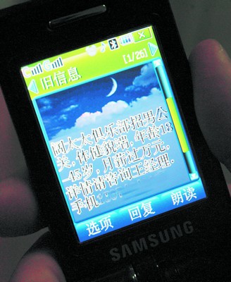 “阔太太俱乐部招男公关,体健貌端,年龄18岁至45岁,月薪过万元。详情请咨询王经理,手机13×××××××××。”2008年4月20日,徐州市民张群(化名)突然收到一条招聘短信。“月收入过万元啊,有这么好的事情。”张群急忙回电话进行咨询。一位自称李经理的人接了电话,一番询问后,李经理对张的条件很满意,并约定在徐州开源名都大酒店(五星级)进行面试。“你到了以后就到大厅打我电话,我们会派人对你进行考察。”李经理说。