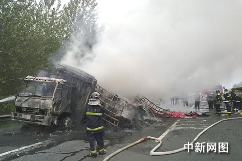 经过火情侦察,火场指挥员立即与高速交警大队人员商议,决定用水枪对车体燃烧部位进行灭火,另一支水枪同时对车厢底部和油箱进行冷却。二十分钟后,明火已灭,堆积的货物却发生阴燃,上方不断冒起浓烟。消防官兵在水枪手的掩护下,冒着烟雾利用挠钩、铁铤等器材清理车上阴燃的货物。