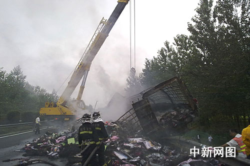 中新网南京七月三十一日电(衡中强 马曲侃 朱晓颖)记者从淮安市消防支队了解到,今日上午在京沪高速公路江苏淮安市段九十三公里处一辆大货车突发自燃,车上所载大量衣服和被套全部被焚为灰烬。由于火势过猛,消防官兵用了两个小时才将大火扑灭。