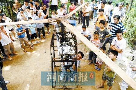 大家争相目睹的是一个由三角铁、钢管、摩托车发动机及榆木板做成的“直升机”。