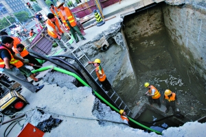 塌陷下方是一处污水井,修污水井须排空污水。现场抢修人员称,从前晚就开始向外排水,排水集团昨日启动数台水泵抽升塌陷现场上游污水,并将污水抽到雨水井。