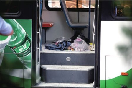 记者看到,公交车前车门处满是灰色粉末,一条淡蓝色牛仔裤、一袋苹果和一些塑料袋堆在车门附近。附近居民猜测,那里正是嫌疑人意图纵火的位置,“警察一直在那附近拍照,那些东西可能也是救火时留下的。”