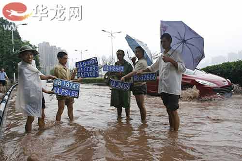 近两天,山城重庆遭受了大暴雨袭击,导致主城有些路段积水深达几米,不少过往车辆犹如在江中行驶,造成一些车牌飘落于积水中。不少“捞客”却从中发现了“商机”,他们将积水中捞出的车牌,在返还车主时,向他们索要100元的幸苦费。