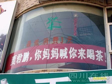 自从“贾君鹏”一词成为新的一轮网络流行语后,一时处处皆是“贾君鹏”。昨(5)日下午2点过,记者从龙泉驿区十陵镇江华路路过时,突然发现路边一茶楼的窗子处挂出了一条横幅,仔细一看不禁雷倒,上面赫然写着:“贾君鹏,你妈妈喊你来喝茶!”