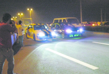 昨日上午,就有市民打进本报热线称,晚上10时,有人组织了18个车友会在成龙路九芝堂药业下个口子的右边举行一场大型飙车活动。不过这名报料者随后又打进电话称活动取消了。昨晚9时40分,记者还是决定赶到现场一探究竟,采访车才行驶至川师南大门时,就不停有改装车从旁边呼啸而过。行驶过九芝堂药业,路边果然停了一长串私家车。从成龙路右拐进入就是经开区的南北干道,两旁也停满了各种各样的私家车,包括206、雨燕、福克斯、奥迪、奔驰等。这些车按车型停放,很多车的外观进行了喷绘,还有很多车甚至加了涡轮增压。一些车主下车聊天,一旁穿着时尚的辣妹十分惹眼。而附近一些居民见此阵仗,举家老小也出来看热闹。几百辆车很多都开着车灯,不时有改装车呼啸而过,路人的目光也随之远去。