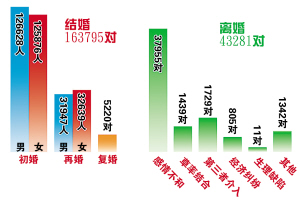 新人笑,离人哭,每个婚姻登记处每一天都在上演不同的悲欢离合。2009年已经过了一半,半年来,有163795对新人走进婚姻殿堂,又有43281对夫妻分道扬镳。昨日,本报邀婚姻专家剖析这半年的婚姻现象,并为不同年龄不同婚龄读者支招。