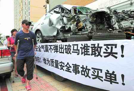 昨日上午,很多途经市中心的市民都目睹了一支稀奇的队伍:尼桑开道,拖车尾随。拖车上躺着一辆银色宝马,车头右侧受损严重,右前车门扭曲,两个前胎都脱离车体。拖车的三面拉着白底黑字的横幅,上书“宝马自然爆胎安全气囊不弹出 破马谁敢买!谁为消费者维权!谁为质量安全事故买单!”等字样。