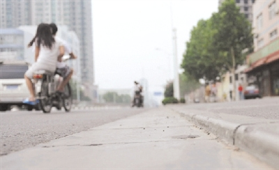 随后,记者再次赶往事故地点,发现“凶手”是快车道和人行道之间的衔接部分。乍一看和其他刚修的路段一样,并不能看出这条路有啥异样,俯身细看,才找到“症结”:快车道和人行道长约20米的交界处,台阶高出快车道约2厘米。