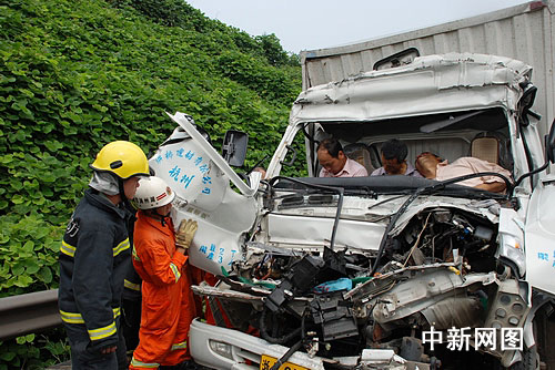 在现场,高速交警部门已经对杭州方向实施警戒。半挂车停在高速公路最右侧紧急通道上,车厢底部保险杠左侧被撞得卷了起来,后部悬挂的备胎也撞得掉了下来。轻型厢式货车整个驾驶室被撞得面目全非,发动机脱落,驾驶室仪表盘将三名司乘人员紧紧的包裹在一起,只露出三人的脑袋,其中驾驶员和坐在中间位置的随车人员已经当场死亡,右侧副驾驶室位置另一名随车人员头部和双腿伤势严重。
