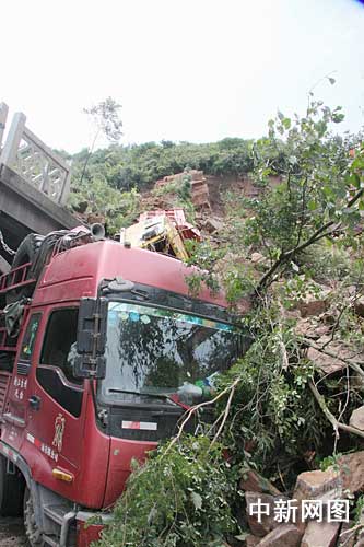 中新社绍兴八月十五日电 ( 江耘 余昌龙 倪春军)八月十五日上午九时许,一0四国道浙江嵊州三界镇清风桥路段发生山体塌方,一万多立方山石袭向一0四国道和清风大桥,造成道路中断,正在行驶的车子被埋山石中。不幸中的万幸,车内的五名遇险人员死里逃生。