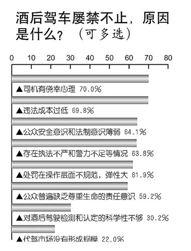 酒后驾车现象屡禁不止,原因是什么?调查中,70.0%的人首选“司机有侥幸心理”,69.8%的人认为是“违法成本过低”,64.1%的人表示“公众安全意识和法制意识薄弱”,59.2%的人表示“公众普遍缺乏尊重生命的责任意识”,22.0%的人选择了“代驾市场没有形成规模”。