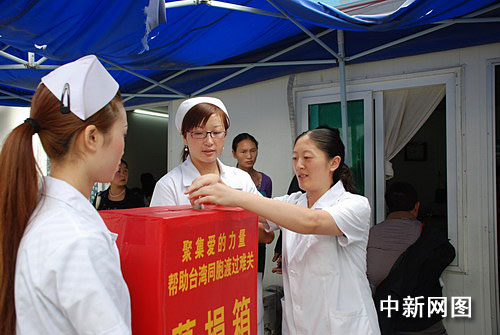 中新网汶川8月19日电(钟美兰 李萍)“我们受灾了,全国都在帮我们,我家现在用的被子,牙刷都还是去年的救灾物资,现在知道台湾遭遇风灾,我也要尽自己的心意。”8月19日,汶川县医院募捐现场,在一群身穿白色衣服的医生护士人群中,一位身穿黄色衣服的人异常显眼,他仔细将手中的10元钱铺平,庄重地放进红色的箱子。