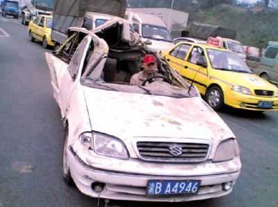昨日,记者在大渝网看到了这则名为《重庆最牛的司机和最雷人的车》的帖子,帖中是一辆车牌号为渝BA49**的白色小车,该车的前端已没有了挡风玻璃,右前方的车灯处只剩下一个大窟窿,其余车灯也都存在明显损坏痕迹,而该车的车顶已经被砸掉了,车窗也仅剩下一面,其车尾更是惨不忍睹,几乎被砸成了一堆卷曲的废铁。