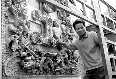 昨天上午,在丰台区京石高速公路西道口附近,来自湖南娄底市新化县的曹永文和他的大型木雕作品“中国兴”,吸引了不少过往行人。一个多星期前,曹永文带着他的这件木雕作品,从湖南老家出发,欲进京将此作品献给人民大会堂或国宾馆,以庆祝建国60周年。