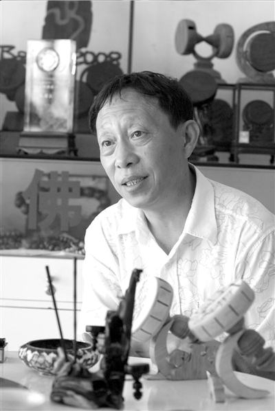 眼下,张国良正制作以纪念建国60周年为主题的空竹。“自5月初开始,光设计就花了近一个月,之后边做边改。”在通州区宋庄镇六合村张国良租用的制作室内,记者看到,在一个红木底座上,五颗红星烘托着一个写有“60”字样的支架,支架上面搁置着空竹。“每一个空竹上面都烙上天坛、长城、鸟巢等代表展示中国变化发展的图案。”