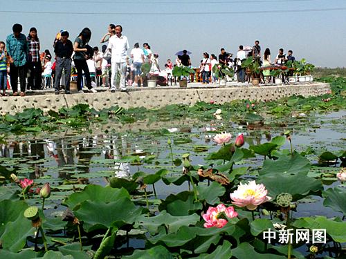 记者24日在青格达湖湿地看到,这里500亩荷花竞相盛开,蔚蓝的17平方公里湖面上多种鸟类翩翩起舞,形成了一幅西域江南水乡景致,吸引各地游前来客赏花观鸟。