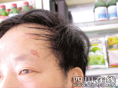 23日上午10点半,记者来到位于旭阳镇北街的农资店,见到了李信良。这名穿着白色T恤的中年男子左上额的擦伤已经结疤,上嘴唇还有淤青,他拂起衣袖,情绪有些激动地说:“看嘛,左手臂这里还有一大块青的!”