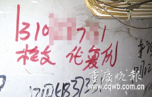前日上午,记者在彭水县文化馆一居民带领下,来到该馆二楼转弯处,墙上满是“办证”、“贷款”等牛皮癣,其中有两块内容最雷人:“131072×××××,迷药、枪支”、“131072×××××,枪支、代复仇”(右图)。
