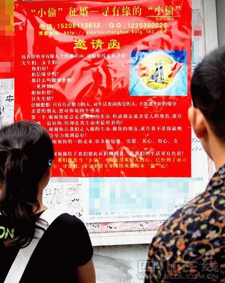 昨日上午11时,记者在沙湾路128号小区门口的告示栏看见了“小偷征婚”的邀请函。大红的邀请函十分显眼,上面用黄、白两色书写着另类的征婚广告词,以及邀请者的联系方式和博客地址。“不务正业还跑出来征婚!”围观者对此表示不屑。