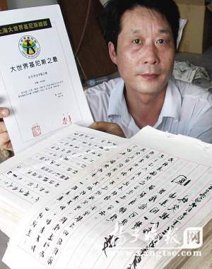 高淳县桠溪镇荆山村农民张正福,利用6年时间反字倒抄红楼梦全集,共120回,86万字,并顺利获得大世界基尼斯之最证书(如左图)。为了给附近村民修建一条长约一千米的水泥路,他决定将这些手抄本卖给有收藏条件的爱好者。