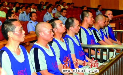 昨日,涉案15名被告人和1家被告单位在东莞中级人民法院过堂受审(如图,苏仕日摄)。公诉机关认为应以销售伪劣产品罪追究其刑事责任。公诉人花了40分钟才读完近万字的起诉状,状中列举了26宗假烟贩卖指控。