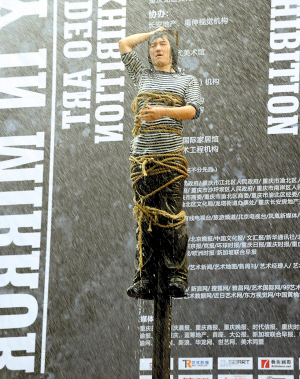 37摄氏度的高温下,26岁的王军被绑在近10米高的柱子上,先是被酷热“折磨”了半小时,后又被环卫车的水龙头冲淋了半小时,耗费了8吨自来水,总共耗时两小时。这个名为《守望》的行为艺术作品昨天下午在黄桷坪102艺术区雷倒了不少人。