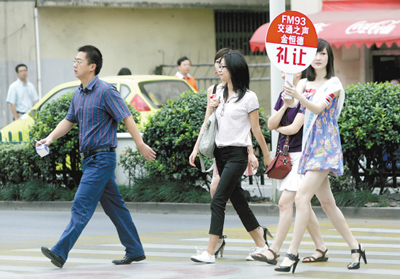 尽管这时的交通还有些繁忙,但过往的司机们看到这么热情的美女,大多很自觉地在斑马线前刹住了车,行人们则从容地过起了马路。