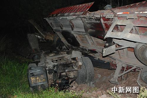 4时15分,消防队员赶到事发路段,只见大挂车正翻倒在路旁,由于侧翻时车体与地面产生摩擦非常大,挂车车头严重变形,满载的钢筋及车体碎片散落一地,事故现场能清晰的看到一条磨擦印。此时,副驾座上的一男子整个身体都已被甩出驾驶室外,但是该男子头部却被卡在右侧车窗处,经现场救护医生判断该名人员已没有了生命体征,已经死亡。