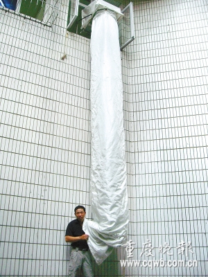 昨日,渝中区七星岗新华日报旧址后面一商住楼,一条10多米长的硕大布袋从4楼窗口伸出,袋口一直垂到地,不断有人从袋口钻出,就像小孩玩“梭梭板”。据了解,这是一种全新的高楼火灾应急逃生工具,名叫逃生缓降管,也称柔性滑道。