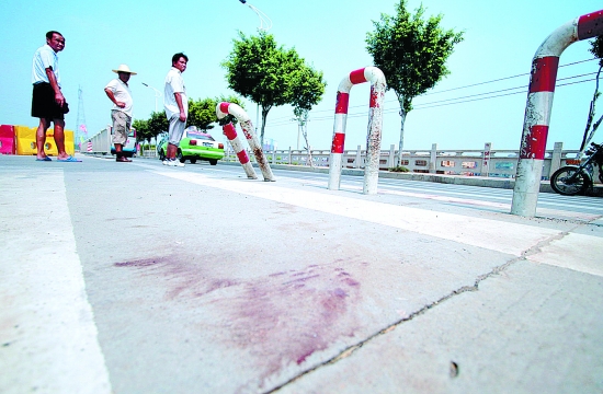 8月27日上午9时许,记者闻讯来到市区江滨体育公园了解案发经过。市公安局刑侦支队、丰泽公安分局刑侦大队及泉秀派出所的经办民警正在现场调查取证,并将当晚值班的保安带回丰泽刑侦大队做笔录。案发现场已看不到什么痕迹了,不过记者在公园门口江滨路上的斑马线中央一排护栏下找到一大片残留的血迹,上面有浮土和清扫的痕迹,在阳光的照射下,仿佛告诉人们这里曾经发生过一场惨剧。