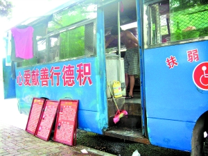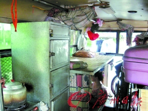 “大篷车”里有两张双人铺,两张单人铺,装了做饭烧水用的煤气灶和煤气罐。行李架塞满了行李,过道里还有两张旧轮椅。大家都说,这个破车就是他们的家。受热带风暴“巨爵”的影响,14日深圳风雨大作,没人看演唱,饭钱就没着落了。14日中午,剩下的面条只够做三碗了,大家只好对付着填了一下肚子。