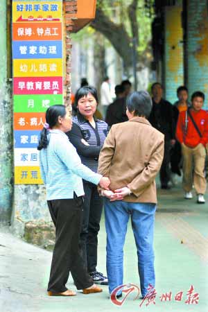广州目前有200多万户家庭,其中至少有20%的家庭要请住家保姆和钟点工。有老人的家庭对保姆需求更大,而到去年底广州市60岁以上的老人有108万,并以每年4%的速度递增。相比急速增长的需求,广州家庭服务业现状却是“小、散、弱”。管理的缺失一直困扰着这个行业的健康发展,如何扭转这一局面?