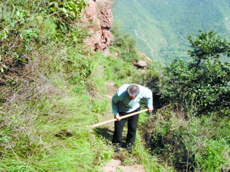 为了生计,李广耗费两年时间,用橛子和铁锨凿出一条1公里长、50厘米宽的山路。