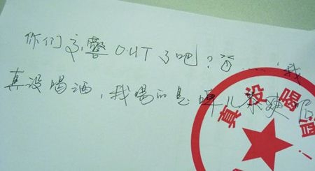 猫扑论坛上的这个“醉酒司机雷人语录”帖子中,发帖者将数名司机醉酒驾车被交警拦截后留下的语录拍成照片。白纸黑字,并且每张纸上的语录都用不同的笔迹演绎出来。网友看了之后直呼“天雷”。不过也有网友怀疑是发帖者自己恶搞出来的,可能现实中并不存在。