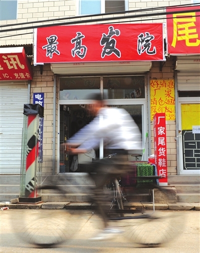 在北七家镇平西府村内,一条纵穿村子南北的主路两侧,分布着大小10多家理发店。在街道中部,有一间面积30平米左右的理发店,大门上方一块红底黑字的招牌醒目地标出了店名:最高发院。招牌还将中间的“发”字特意放大。