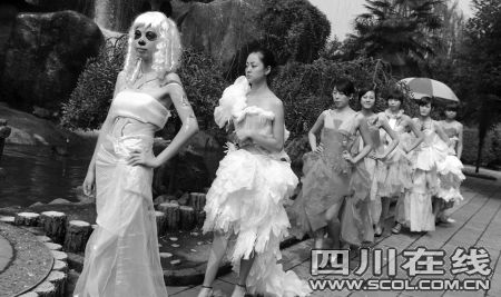 活动现场,七八名大学生美女志愿者身穿五颜六色,用纸袋、塑料袋、筷子和孔雀羽毛等奇异材料制成的服装为游客们献上了一场别出心裁的时装秀,向每一位游客宣传环保理念。据了解,这些纸装是武汉一高校服装设计专业的学生精心制作的,他们希望和成都的同学共同呼吁市民爱护环境。来自武