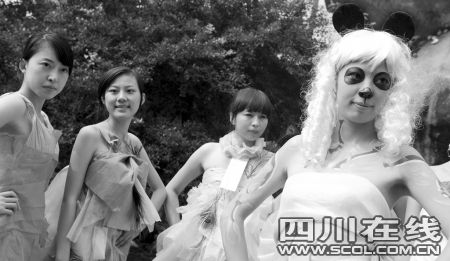 “怎么把眼睛和鼻子都涂黑了呀?哦!原来是熊猫模特儿,看,身上还画了竹子呢!”昨日上午,在成都塔子山公园鸟语林,一位美女模特头戴白色假发,眼睛、鼻子都被涂成黑色,把自己装扮成一只大熊猫。除了这种人体彩绘,参加活动的大学生志愿者还表演了一场精彩的环保纸装秀,她们用这种健康、绿色、和谐的方式来向大家倡导环保理念,吸引了众多游人观看。