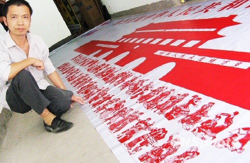 二十四日,记者看到,该剪纸长约十米,宽两米,以红白两色为主,线条活泼流畅,人物形态逼真。剪纸上方为“热烈庆祝中华人民共和国成立六十周年”十七个大字;中间接红色天安门城楼,显得巍峨壮观;再往下是天安门广场,五十六个民族的代表分两行排列,身着独具民族特色的服饰,或欢歌或舞蹈,五十六个民族团结一致、喜迎国庆之情跃然于纸上。