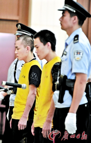 9时45分,张方均、张方述被法警押进法庭。谢守翠的眼泪夺眶而出,但她嗫嚅着嘴唇,没有哭出声……