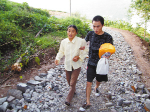 经过一个半小时的车程,张家母子回到了熟悉的临江镇安乐村,因为通往家中的水泥公路未通车,在离家200米远处,母子俩只能下车步行。