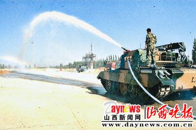 今日一大早,朔州市消防支队门口就围了一群人。9时许,演练开始,消防坦克车以每小时30公里的速度冲向前方的障碍物,它轻松地翻过0.5米高的障碍物后,又跨过两米宽的壕沟,将前方十余吨重的沙袋轻而易举地推开,自动炮打出的水柱可仰角90度、俯角36度喷射,也可水平旋转180度喷射。
