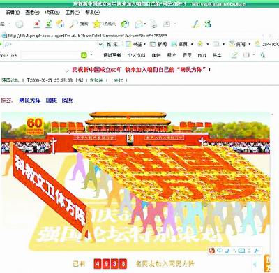 记者看到,“网民方阵”的页面,以宽阔的天安门广场为背景,伴随着《歌唱祖国》等歌曲,由五颜六色的“网民”组成的虚拟游行队伍,分成九大方阵,一队队地整齐走过。虽然不能和国庆庆典相比,但不少网友还是觉得:“真好,我也可以参与国庆庆祝活动,光荣啊!”