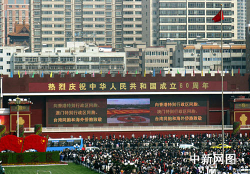 记者上午9时许来到兰州东方红广场看到,这里早已是人山人海,川流不息。10时,当党和国家领导人在首都天安门城楼上的画面出现,此间民众不约而同的鼓掌欢迎。