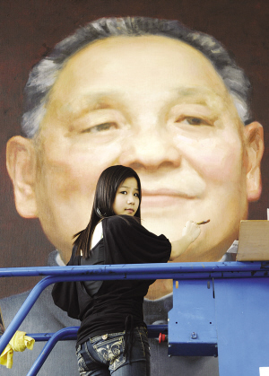 1日上午,新中国成立60周年庆祝大会在北京天安门广场及长安街沿线举行。当游行队伍簇拥着新中国4位不同时代领导人毛泽东、邓小平、江泽民和胡锦涛的巨幅画像走过天安门广场时,4位领袖的原音首次在广场上先后重现,象征着新中国发展历程中4座伟大的里程碑,令全国观众印象深刻。当“春天的故事”方阵簇拥着的改革开放总设计师邓小平巨幅画像经过天安门广场时,站在天安门广场上一位1988年出生的南京女孩特别激动,因为她参与绘制了这幅6米高、5米宽的肖像油画。她的名字叫周末,中央美院的学生。