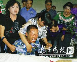 本报(扬子晚报)《为神圣一刻,父子生死等候54天》报道发出后,连日来在全国产生了很大反响,成千上万的网友和读者被袁亚萍的大义、坚强所深深感动,称她为“伟大母亲”。58天编织善意谎言,58天独自忍受煎熬。昨天,母亲袁亚萍终于等来了自己期盼的时刻——儿子王震在胜利完成首都国庆阅兵任务后,光荣返回家乡大丰。在得知真相的那一刻,王震50多天来对父亲无限的牵挂,瞬间化为无尽的哀痛。当他得知母亲为了完成对自己承诺,将爸爸遗体从山东运回家乡存放58天,并编织一个个谎言,就是为了让自己顺利完成受阅任务时,这位坚毅的军人再也忍受不住内心的悲痛,和妈妈抱头痛哭……