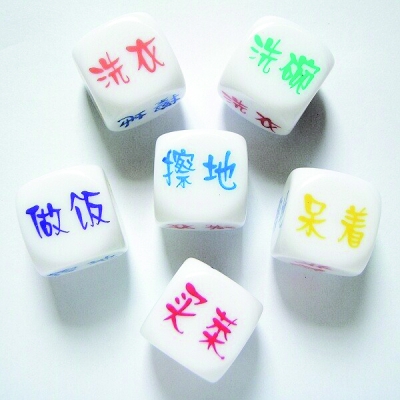 “摇的不是骰子,是寂寞”,近日,网友“莫莫”在QQ空间写下一篇博客,称自己老婆心血来潮买回来两个骰子,而骰子的六面竟是:买菜、做饭、洗衣、洗碗、擦地、发呆,绝大部分是家务活。“莫莫”称,有了这个骰子让他顿时感到无力与命运抗争,并将该骰子起名为“黯然销魂骰”。记者调查发现,“家务骰子”在80后小夫妻中很流行,在淘宝网上就有1000多家店铺在卖这种骰子。