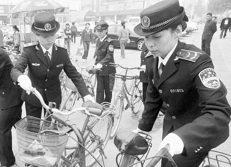 10月9日,城管女子中队队员们将便道上的自行车摆放整齐。