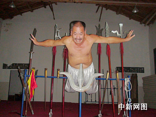 中新网永春10月12日电 (林永传 颜尧民 施由森)以腹部作为支点,双脚支在铁栏上,然后整个人身体悬空,普通人一般无法做到这点,而福建永春县白鹤拳师颜大石却可以以锋利的钢叉作为支点,整个人悬空,其白鹤内功令人叫绝。